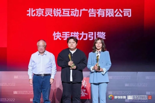 中国传媒大学丁俊杰教授为北京灵锐互动广告有限公司、快手磁力引擎颁发全场大奖