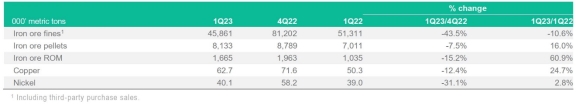 铁矿石粉矿和球团销量同比下降7%,系北部系统雨季装货量受限以及在2022年第四季度取得强劲销售后供应链再平衡所致。淡水河谷预计今年下半年的销售情况将抵消这一影响,全年销售计划保持不变。