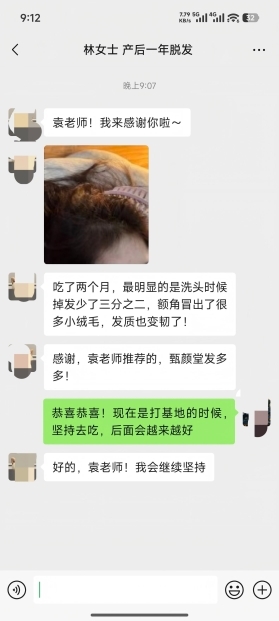 用户@林女士反馈:“吃了两个月,最明显的是洗头时掉发少了三分之二,额角冒出了很多小绒毛,发质也变韧了。”